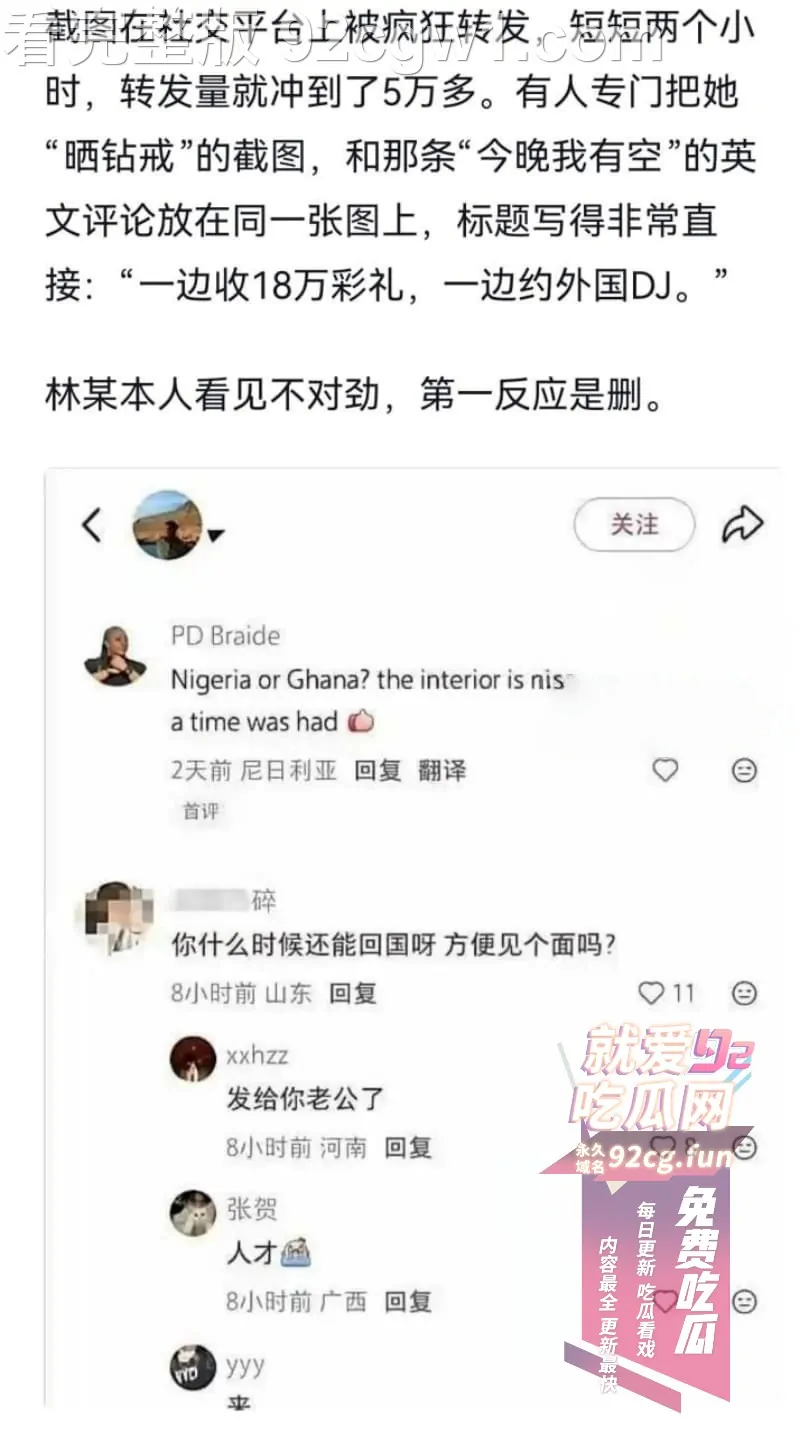 一边还想和外国黑人DJ花前月下,风花雪月,一边还要在国内寻找接盘侠,这既要又要的如意算盘打得叮当响,不料却栽在了万能的网友手里。真是天不藏垢,地不纳污,瓜友们快看看这个媚黑婊!
